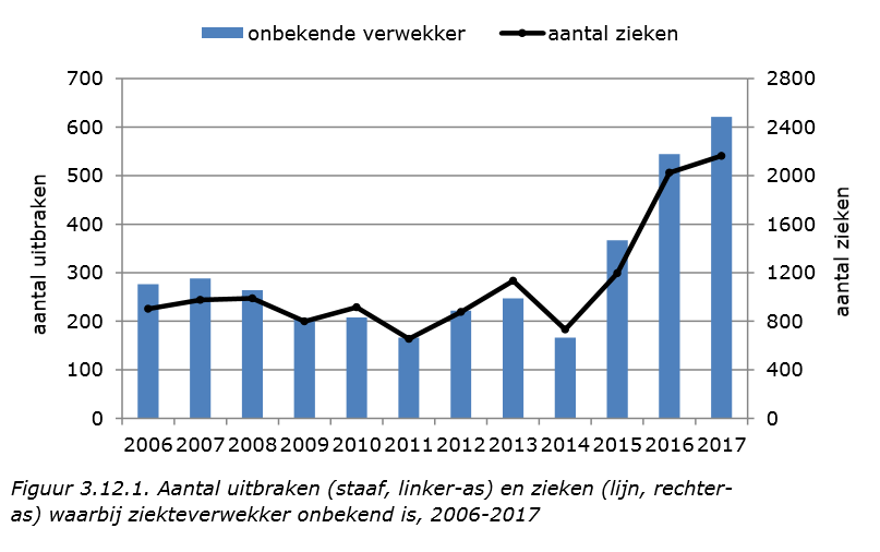 The number of outbreaks reported through the GGDs is much lower than through NVWA, but with an average of more sick per outbreak.