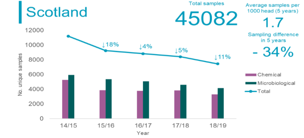 Historically, local authorities had a target of two samples per 1,000 of the population for microbiology and three per 1,000 for chemical samples. However, SFSD data shows in 2018-2019 the figure had fallen below one sample per 1,000 of the population for chemical and microbiological sampling.
