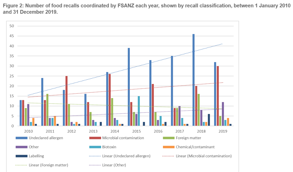 Recalls are classified by FSANZ under microbial contamination, labelling, foreign matter, chemical/other contaminants, undeclared allergen, biotoxin and other.