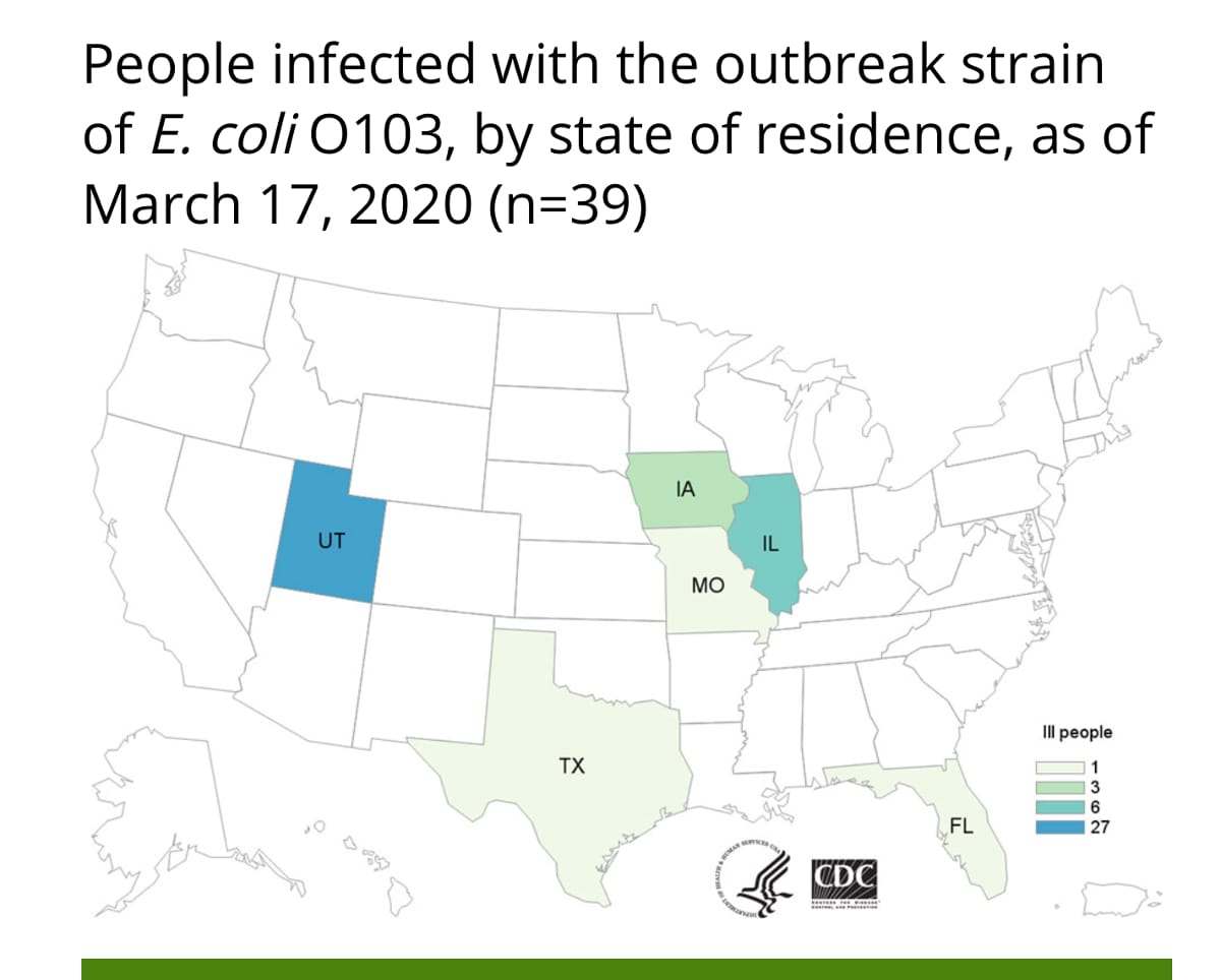 Updates from the FDA and CDC this afternoon reported the six-state outbreak has now sickened 39 people, with 27 of them in Utah. Iowa has 3 cases, Illinois has 6 and there is one each in Missouri, Texas, and Florida. Two people have been admitted to hospitals. No deaths have been reported to federal officials.