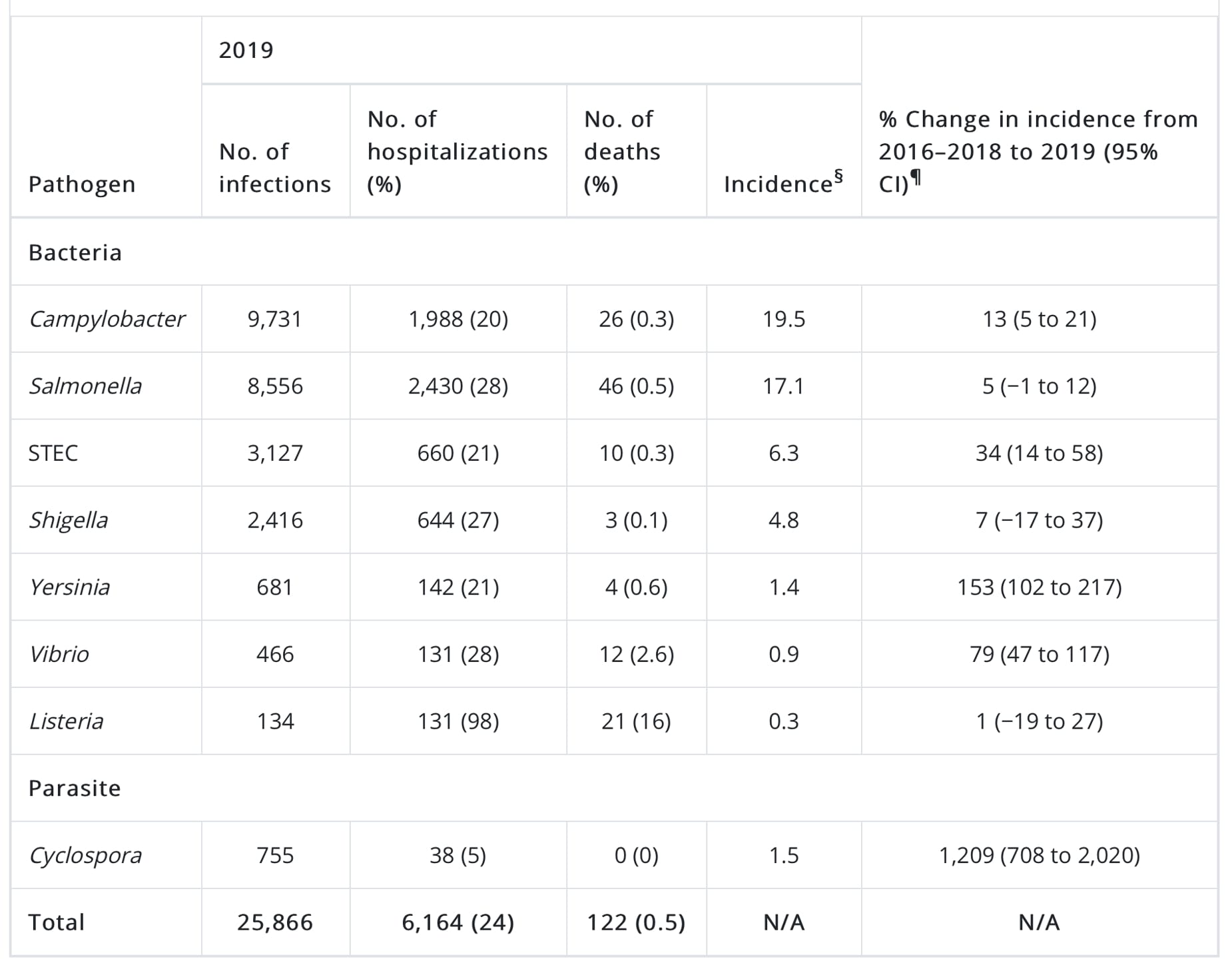 Number of laboratory-diagnosed bacterial and parasitic infections, hospitalizations, and deaths, incidence and percentage change compared with 2016–2018 average annual incidence rate, by pathogen —10 U.S. sites, Foodborne Diseases Active Surveillance Network (FoodNet),* 2016–2019†