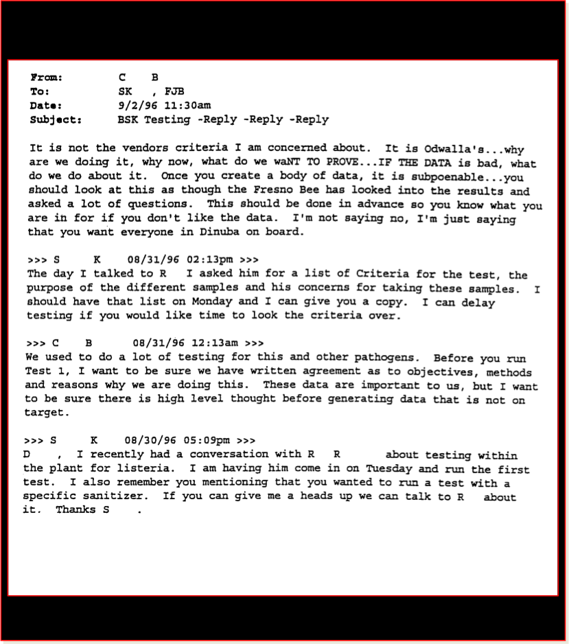 Despite being told by the Army that it would not buy Odwalla’s product, Odwalla continued to ignore the warnings and to not test its product, because it did not want to document that it was in fact unsafe.