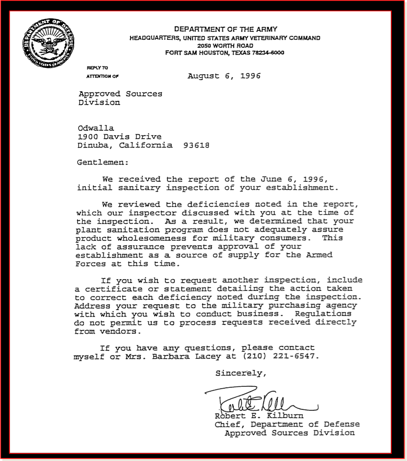 During the course of the litigation, we uncovered that Odwalla had attempted to sell its juice in 1996 to the U.S. Army – no, not as a biological weapon – but to be sold in base grocery stores to our men and women service members and their families. The Army rejected the product – because it was not fit for military consumers. This letter tells that story: