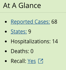 So far, there have been 68 reported cases of Salmonella Enteritidis resulting in 14 hospitalizations. The full report can be read here.