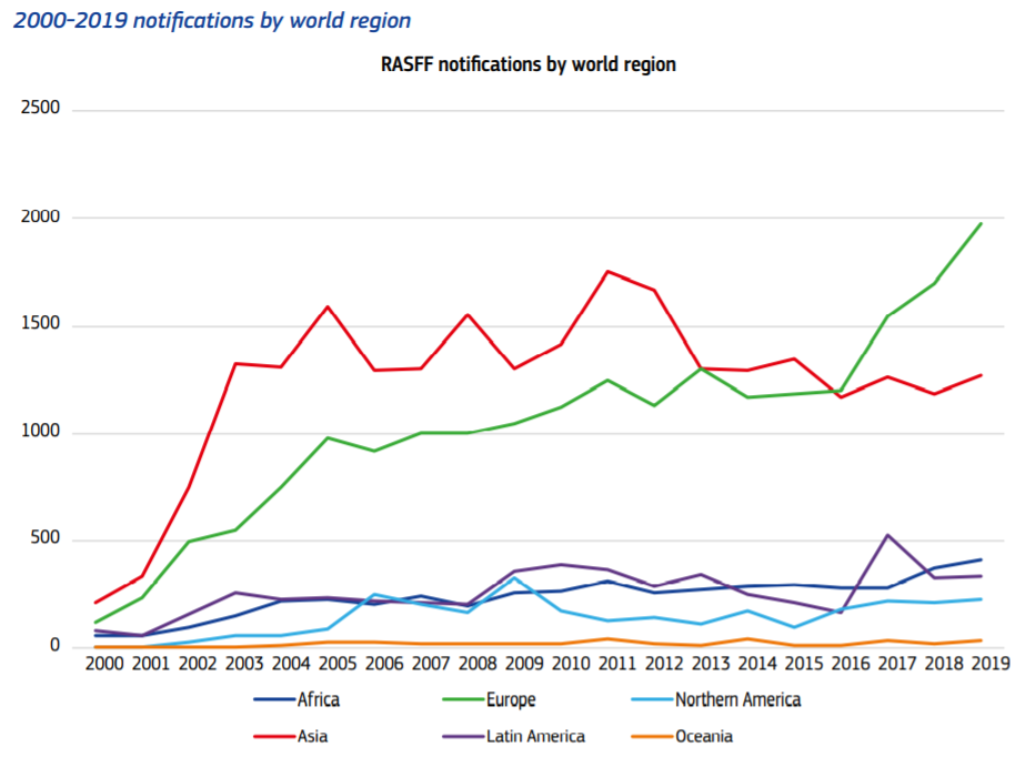 In 2019, 4,118 original notifications were transmitted through the Rapid Alert System for Food and Feed (RASFF) which gave rise to 10,388 follow-up notices compared to 3,699 original notifications in 2018.