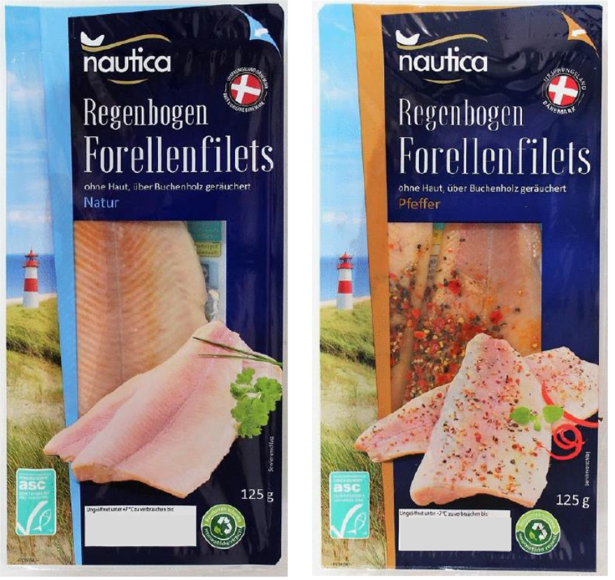Nautica Regenbogen Forellenfilets 125-gram in the varieties of natural and with pepper are affected and have DK 4566 EG on the package.