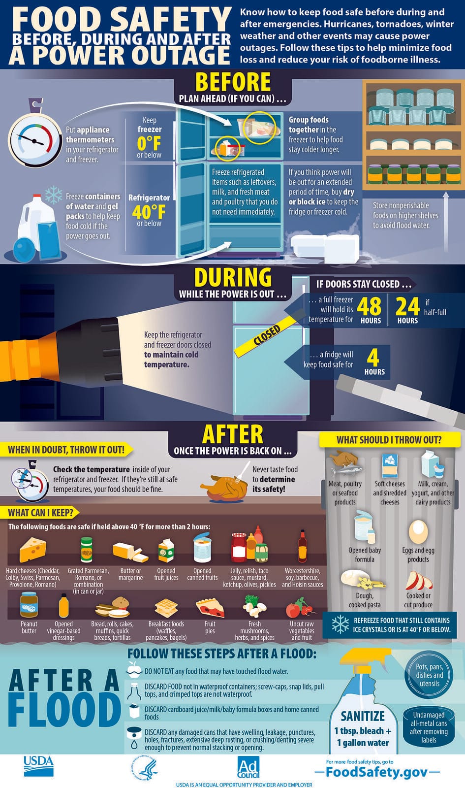 FSIS’ YouTube video “Food Safety During Power Outages” has instructions for keeping frozen and refrigerated food safe.