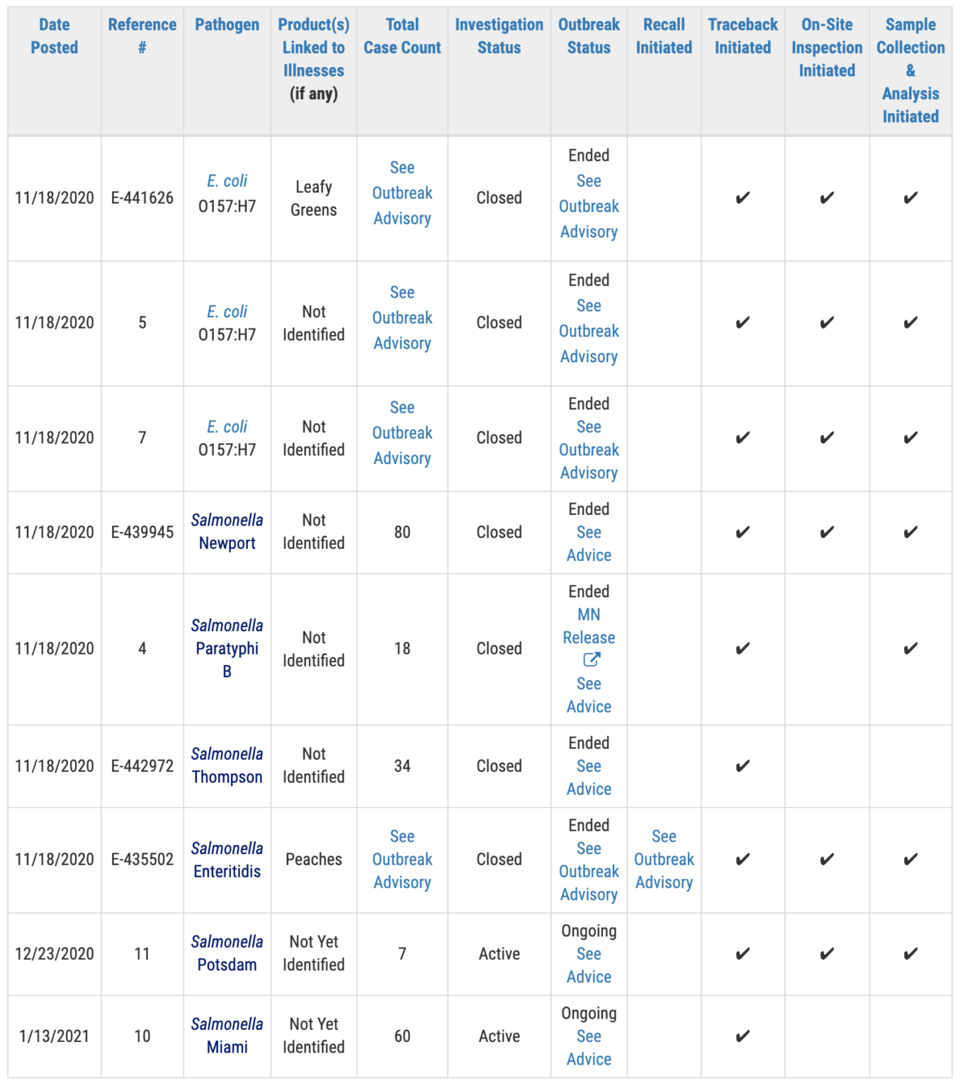 A public health advisory will be issued for outbreak investigations that have resulted in specific, actionable steps for consumers to take to protect themselves. Please direct your attention to those pages for the most up to date information on the investigation and for consumer protection information.