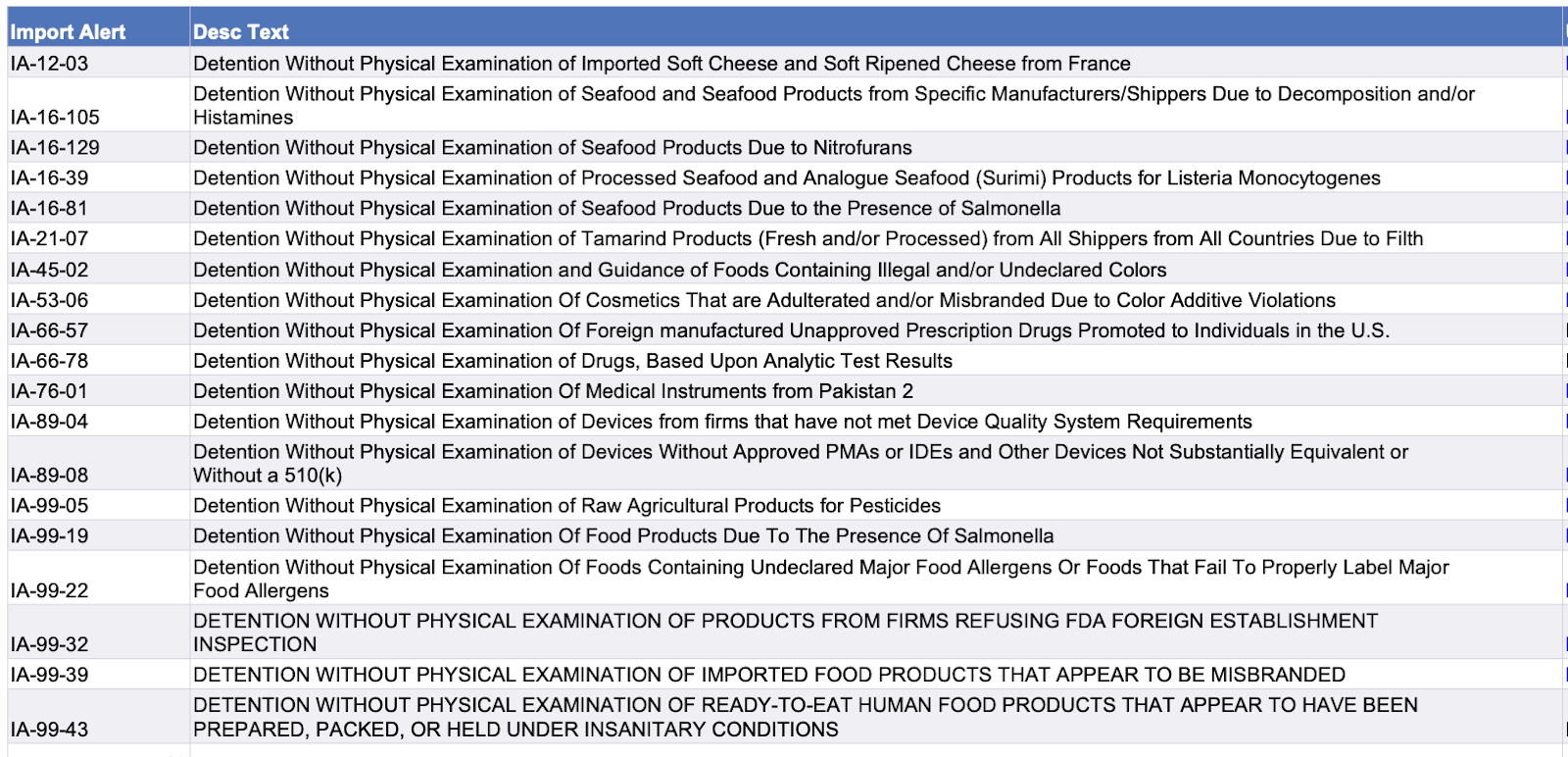Recent modifications to FDA’s import alerts, as posted by the agency, are listed below. Click on the table to go to the FDA page with links for specific details about various alert modifications.