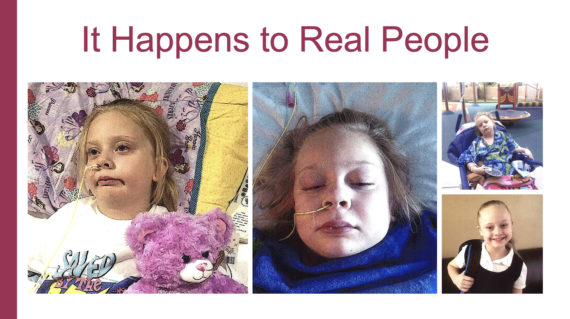 • Requires 24-hour, 100% assistance for all activities of daily living – risk of aspiration and death at all times