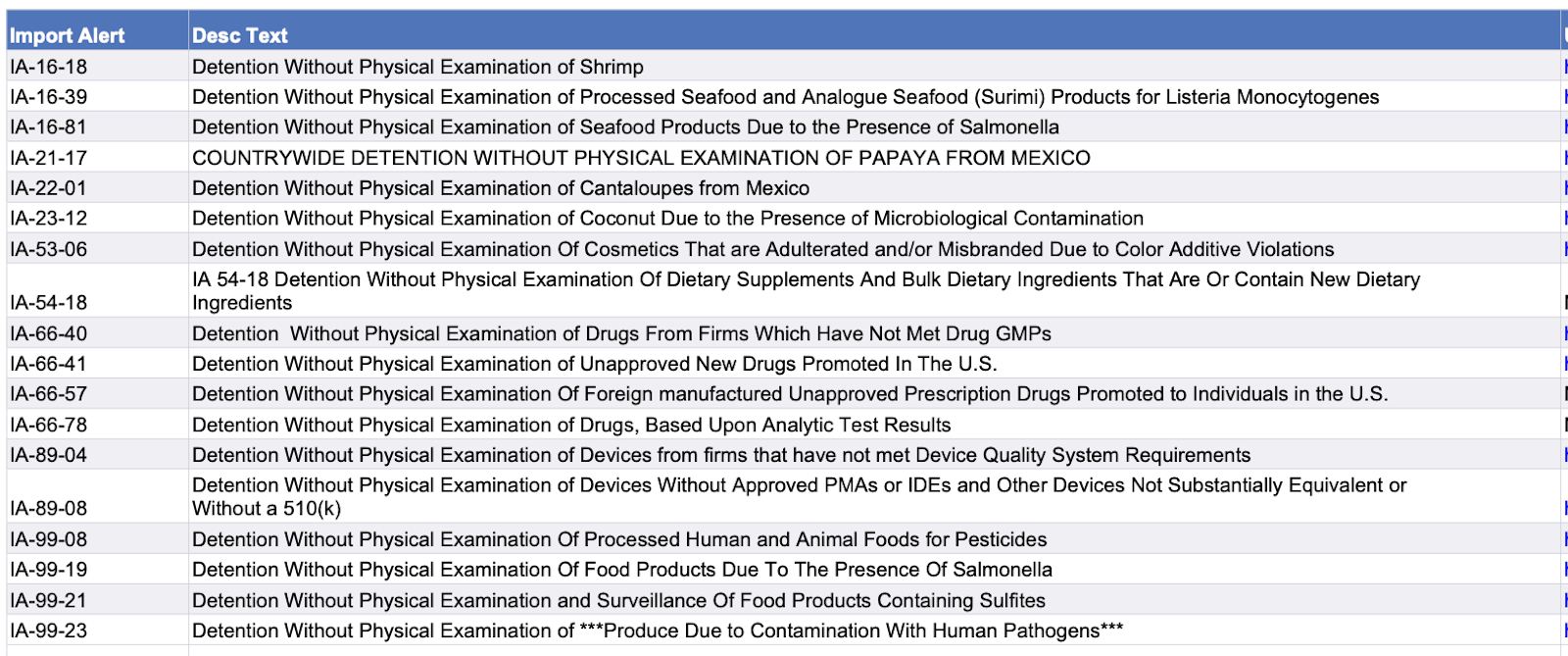 Recent modifications to FDA’s import alerts, as posted by the agency, are listed below. Click on the table to go to the FDA page with links for specific details about various alert modifications.