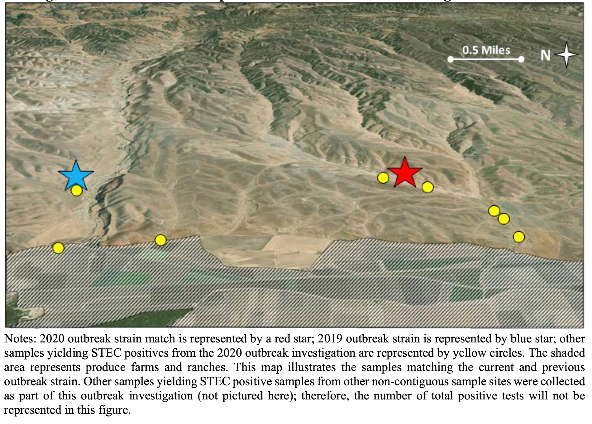 “. . . recent investigation findings and previous foodborne illness outbreak investigation findings dating back to 2013 suggest that a likely contributing factor for pathogenic E. coli contamination of leafy greens has been the proximity of cattle. Cattle have been repeatedly demonstrated to be a persistent source of pathogenic E. coli including E. coli O157:H7. . .