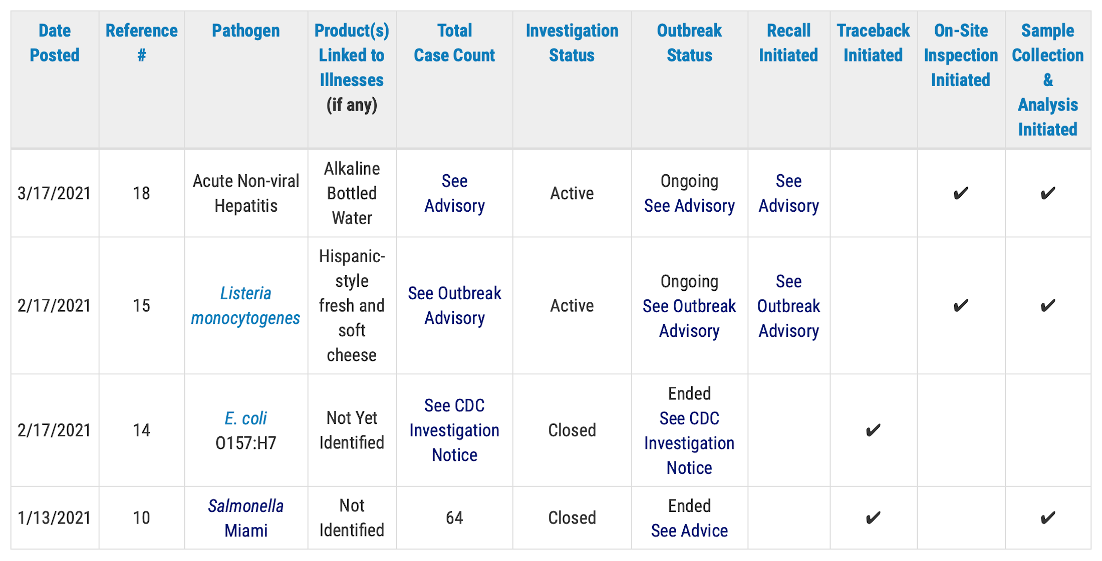 The Food and Drug Administration will issue public health advisories for outbreak investigations that have resulted in specific, actionable steps for consumers — such as throwing out or avoiding specific foods — to take to protect themselves, according to the outbreak table page.