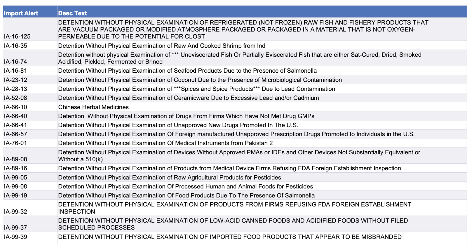 Recent modifications to FDA’s import alerts, as posted by the agency, are listed below. Click here to go to the FDA page with links for specific details about various alert modifications.