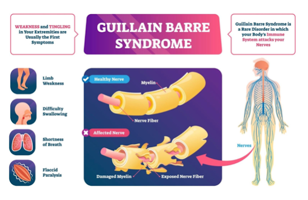 Guillain-Barré syndrome (GBS) is a disorder in which the body’s immune response, typically to an infection, causes nerve damage. The syndrome is rare, affecting about one to two people in 100,000 each year. It can present as a very mild case of brief weakness to devastating paralysis, affecting the muscles that allow a person to breathe on their own. Fortunately, most people eventually recover from even the most severe cases of Guillain-Barré, although some are left with some level of weakness. Guillain-Barré syndrome is not contagious.