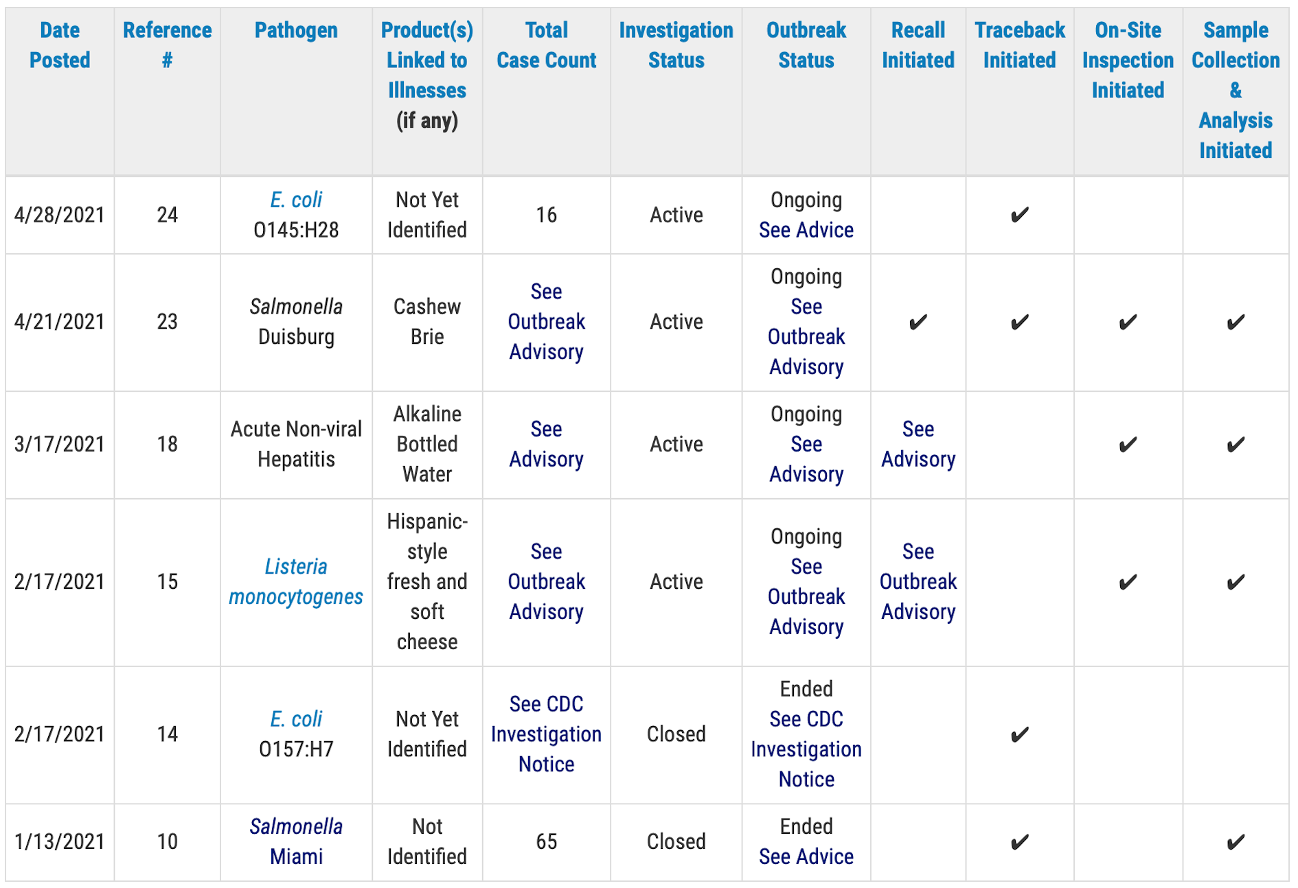 The Food and Drug Administration will issue public health advisories for outbreak investigations that have resulted in specific, actionable steps for consumers — such as throwing out or avoiding specific foods — to take to protect themselves, according to the outbreak table page.
