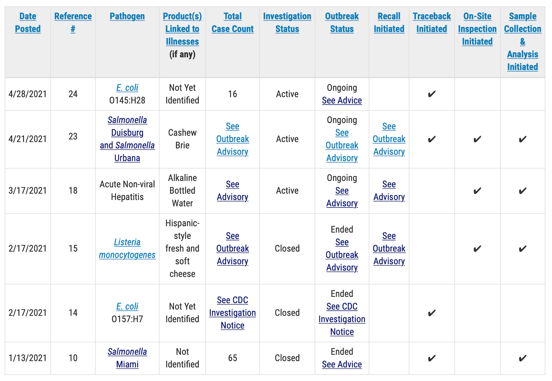 The Food and Drug Administration will issue public health advisories for outbreak investigations that have resulted in specific, actionable steps for consumers — such as throwing out or avoiding specific foods — to take to protect themselves, according to the outbreak table page.