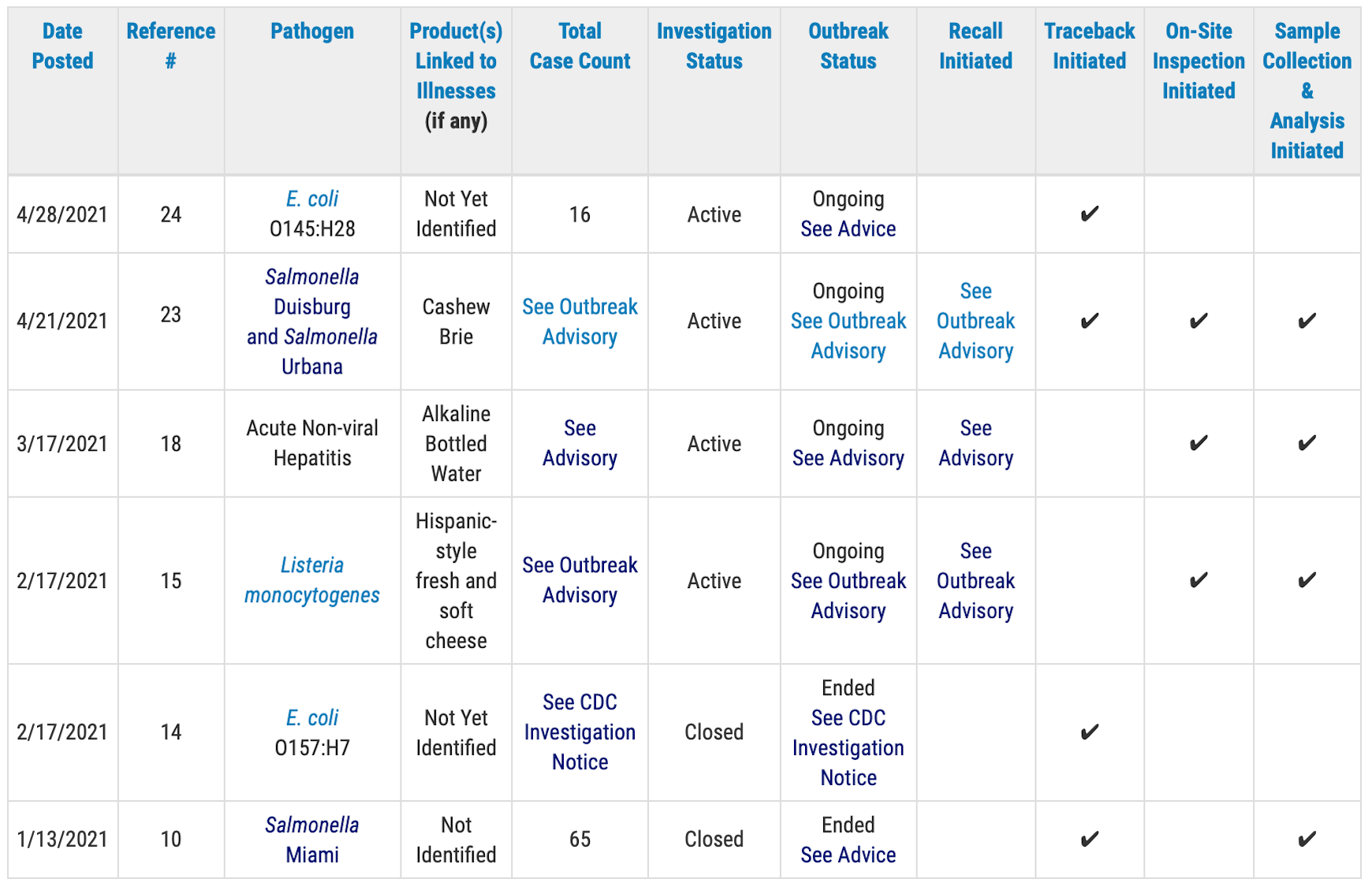 The Food and Drug Administration will issue public health advisories for outbreak investigations that have resulted in specific, actionable steps for consumers — such as throwing out or avoiding specific foods — to take to protect themselves, according to the outbreak table page.