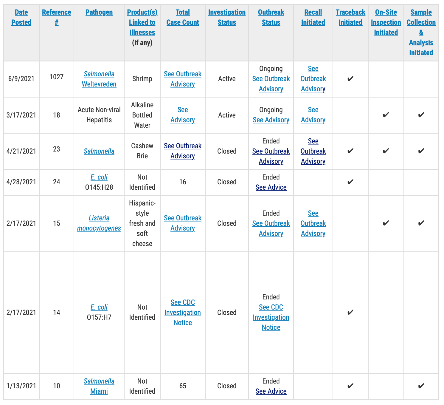 The Food and Drug Administration will issue public health advisories for outbreak investigations that have resulted in specific, actionable steps for consumers — such as throwing out or avoiding specific foods — to take to protect themselves, according to the outbreak table page.