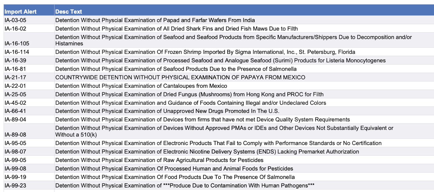 Recent modifications to FDA’s import alerts, as posted by the agency, are listed below. Click here to go to the FDA page with links for specific details about various alert modifications.