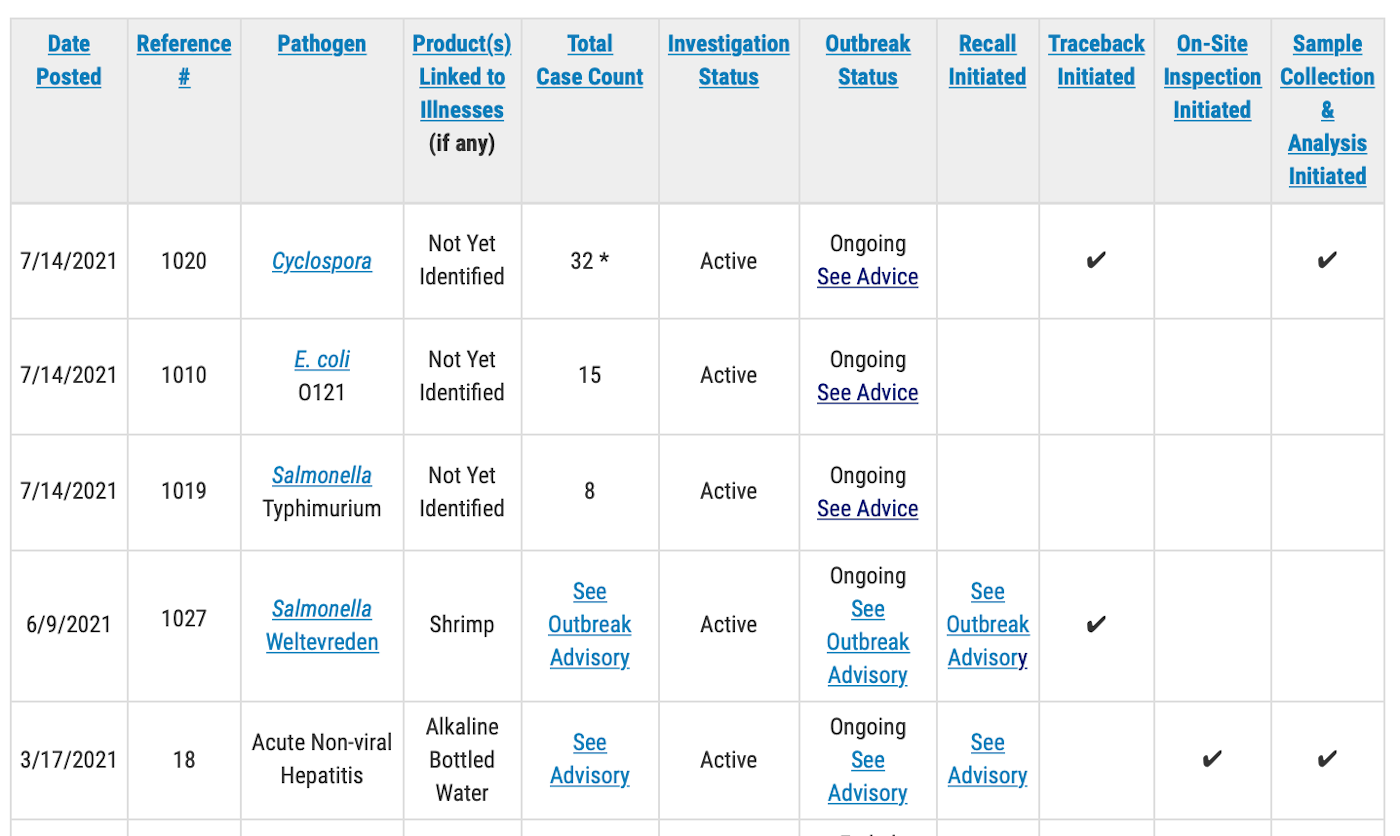 The Food and Drug Administration will issue public health advisories for outbreak investigations that result in “specific, actionable steps for consumers — such as throwing out or avoiding specific foods — to take to protect themselves,” according to the outbreak table page.