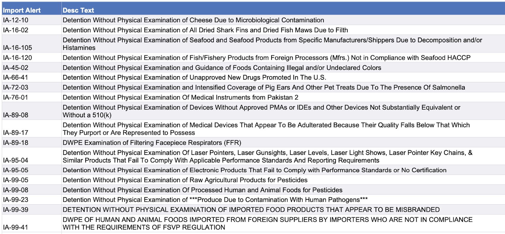Recent modifications to FDA’s import alerts, as posted by the agency, are listed below. Click here to go to the FDA page with links for specific details about this week’s various alert modifications.