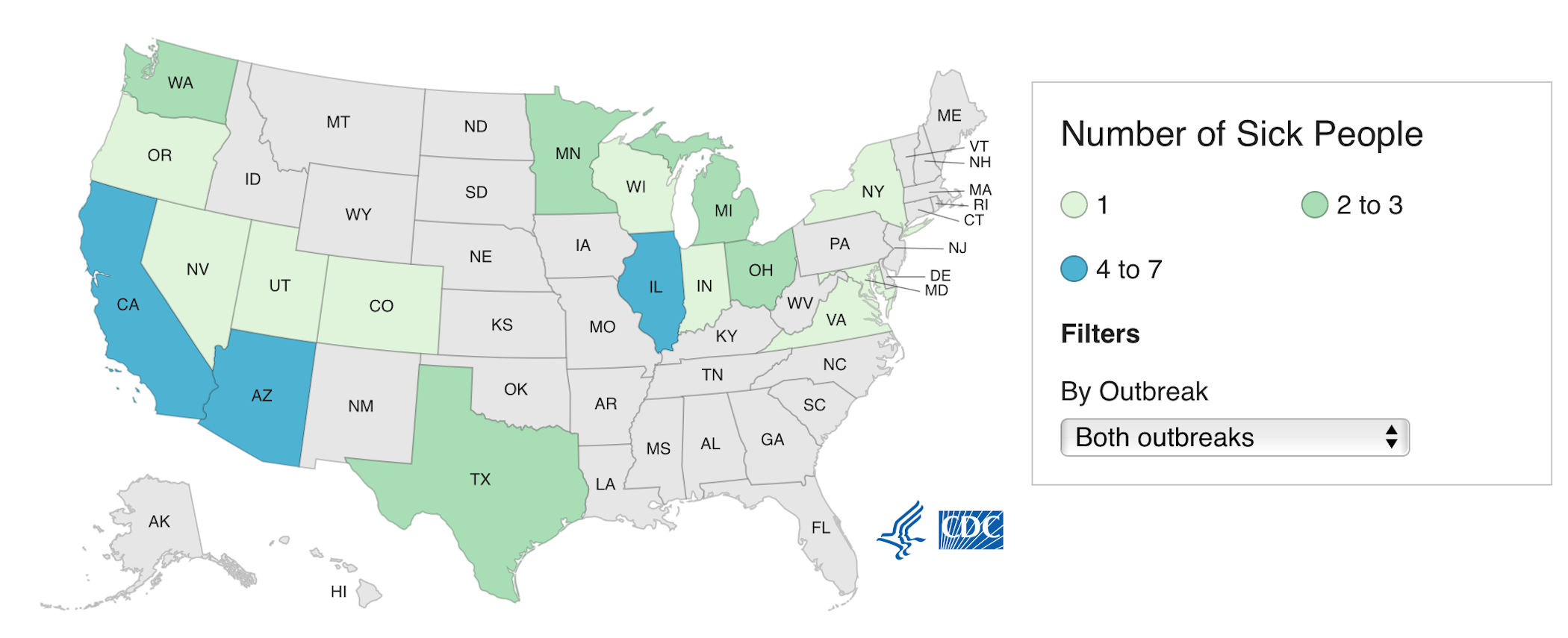 Thirteen sick people have been reported from seven states. Illnesses started on dates ranging from May 9 to June 24. Sick people range in age from 1 to 74 years old, with a median age of 41 years, and 31percent are male. Of 10 people with information available, three have been hospitalized. No deaths have been reported.