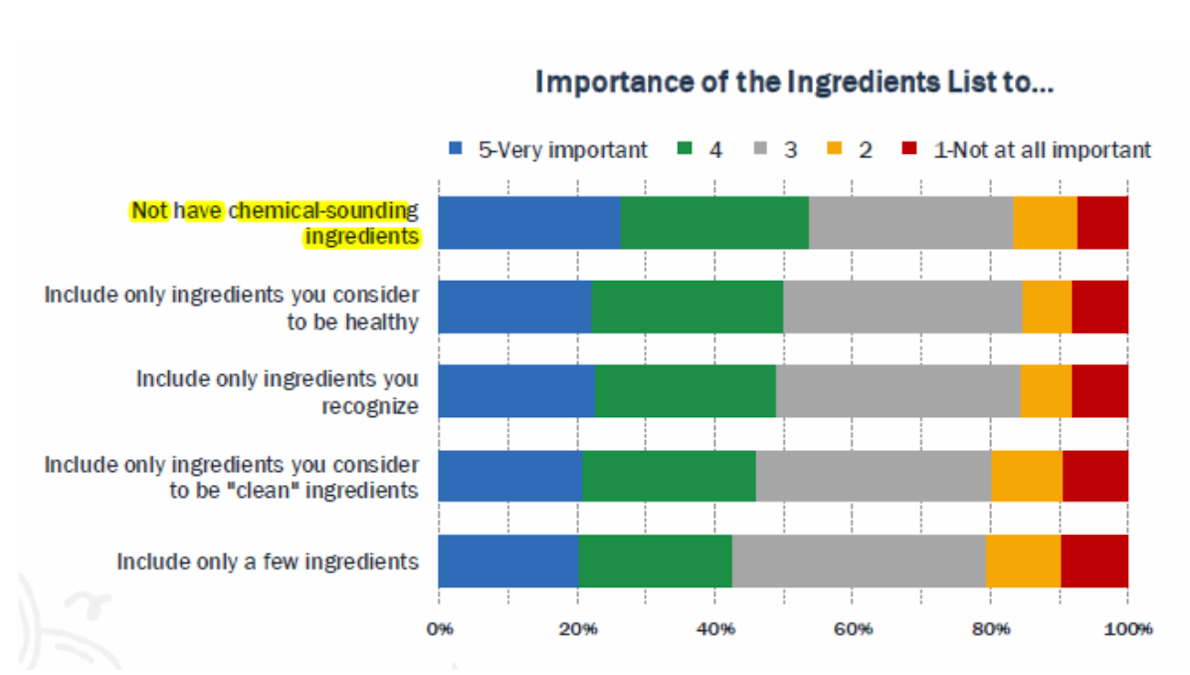 - 54 percent of consumers reported it is important that ingredients do not have “chemical-sounding names” including 26 percent that rate it “very important.” Their opinion is primarily based on food safety and healthfulness concerns.