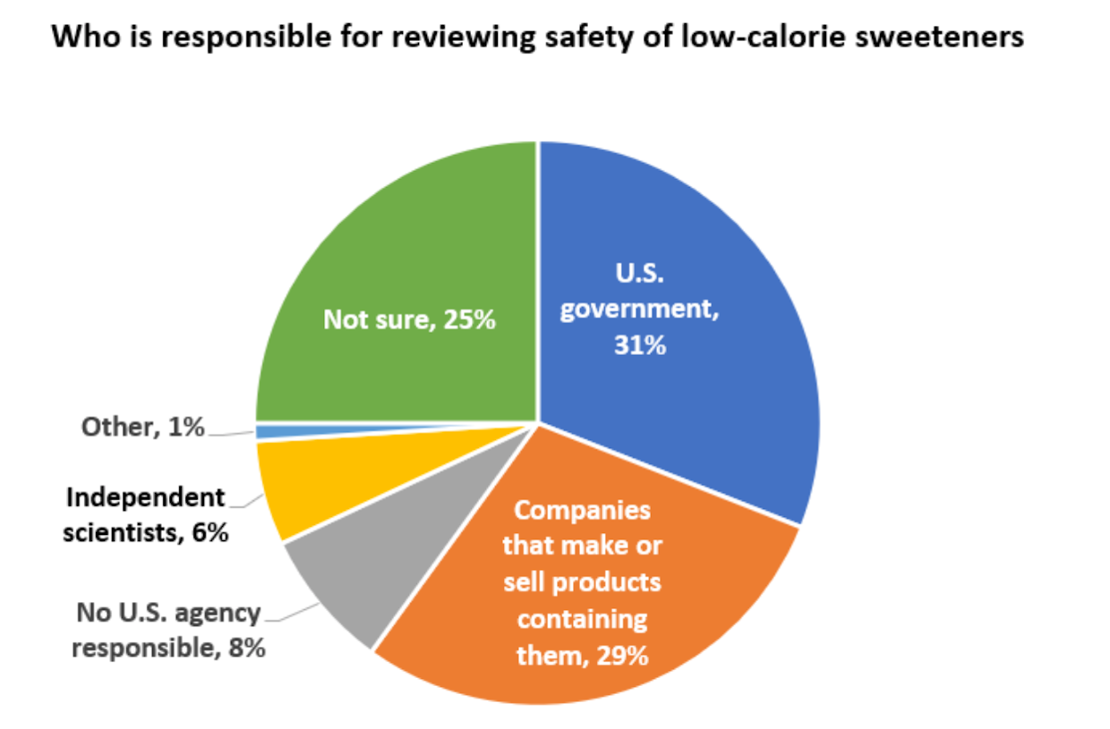 In its 2021 survey, IFIC apparently sought to better understand why consumers were so hesitant to accept that low/no calorie sweeteners are safe. It asked consumers who they thought was responsible for reviewing the safety of these chemicals. Presumably, if consumers thought that food manufacturers were responsible for the review and not the federal government, they would recognize the companies’ bias and be more hesitant. However, 29 present of the surveyed thought companies are responsible for safety of their products.