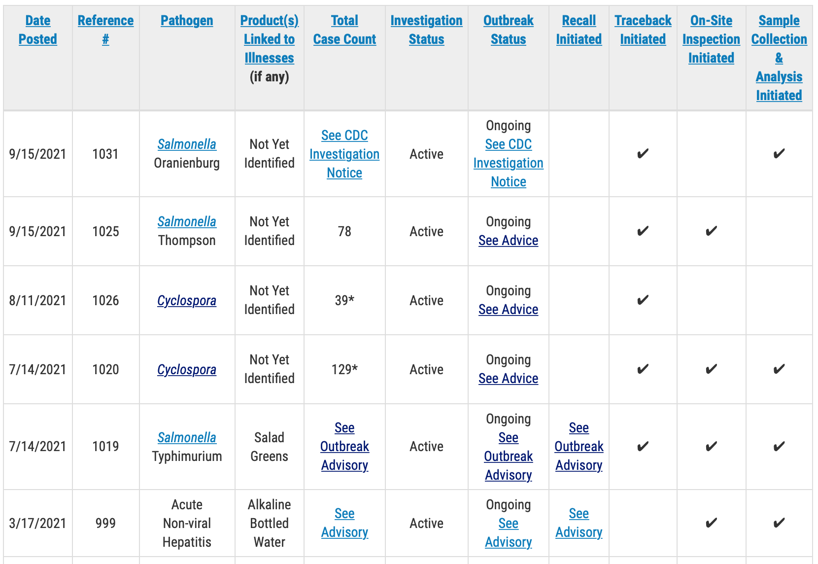The Food and Drug Administration will issue public health advisories for outbreak investigations that result in “specific, actionable steps for consumers — such as throwing out or avoiding specific foods — to take to protect themselves,” according to the outbreak table page.