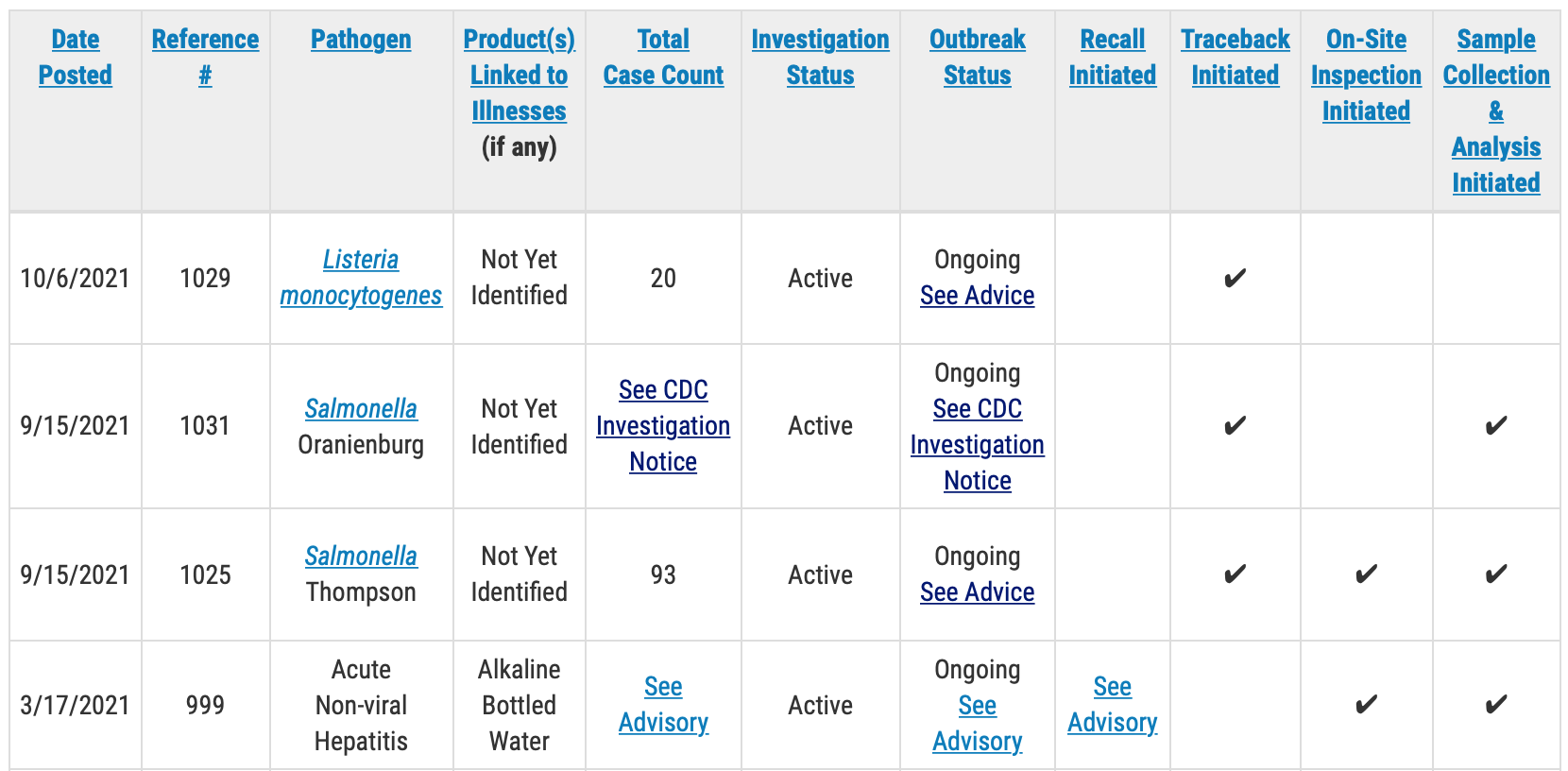 The Food and Drug Administration will issue public health advisories for outbreak investigations that result in “specific, actionable steps for consumers — such as throwing out or avoiding specific foods — to take to protect themselves,” according to the outbreak table page.