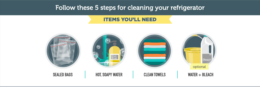 - Wipe food containers and drink containers with hot, soapy water before returning to the clean refrigerator.