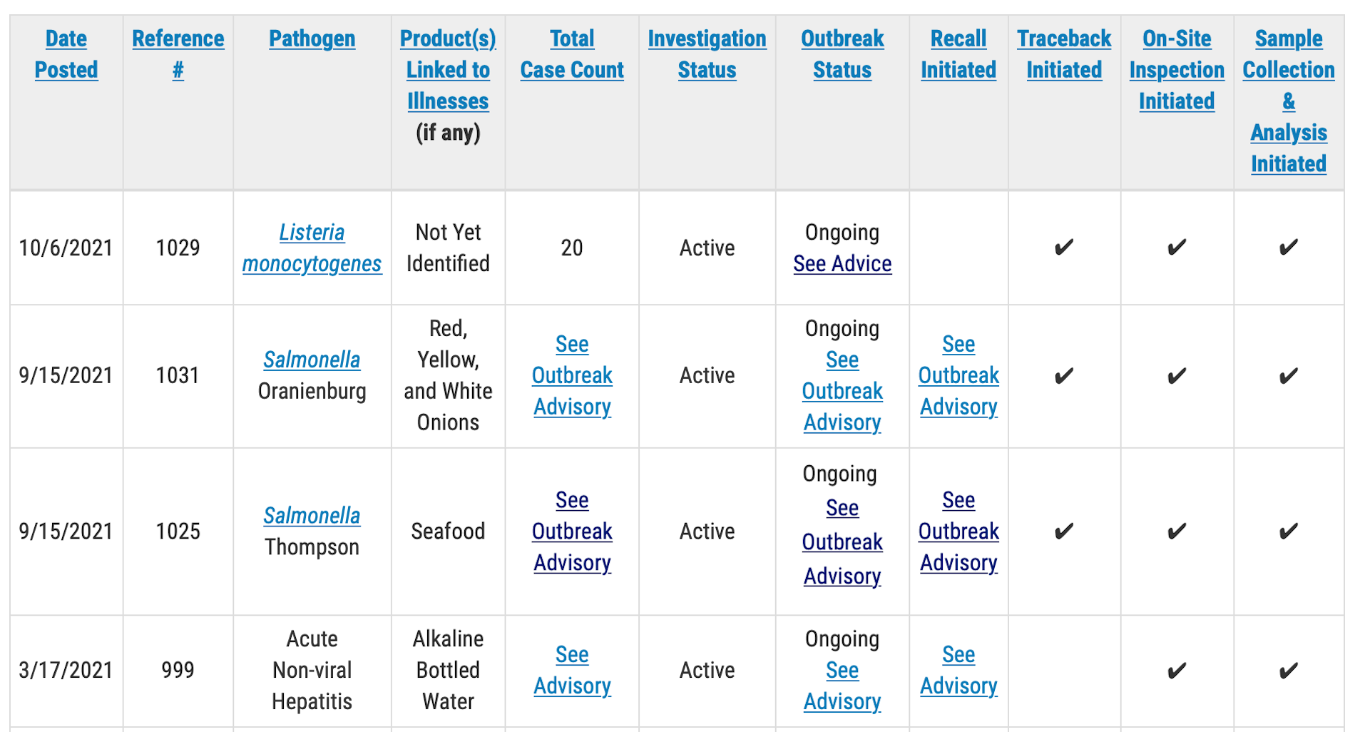 The Food and Drug Administration will issue public health advisories for outbreak investigations that result in “specific, actionable steps for consumers — such as throwing out or avoiding specific foods — to take to protect themselves,” according to the outbreak table page.