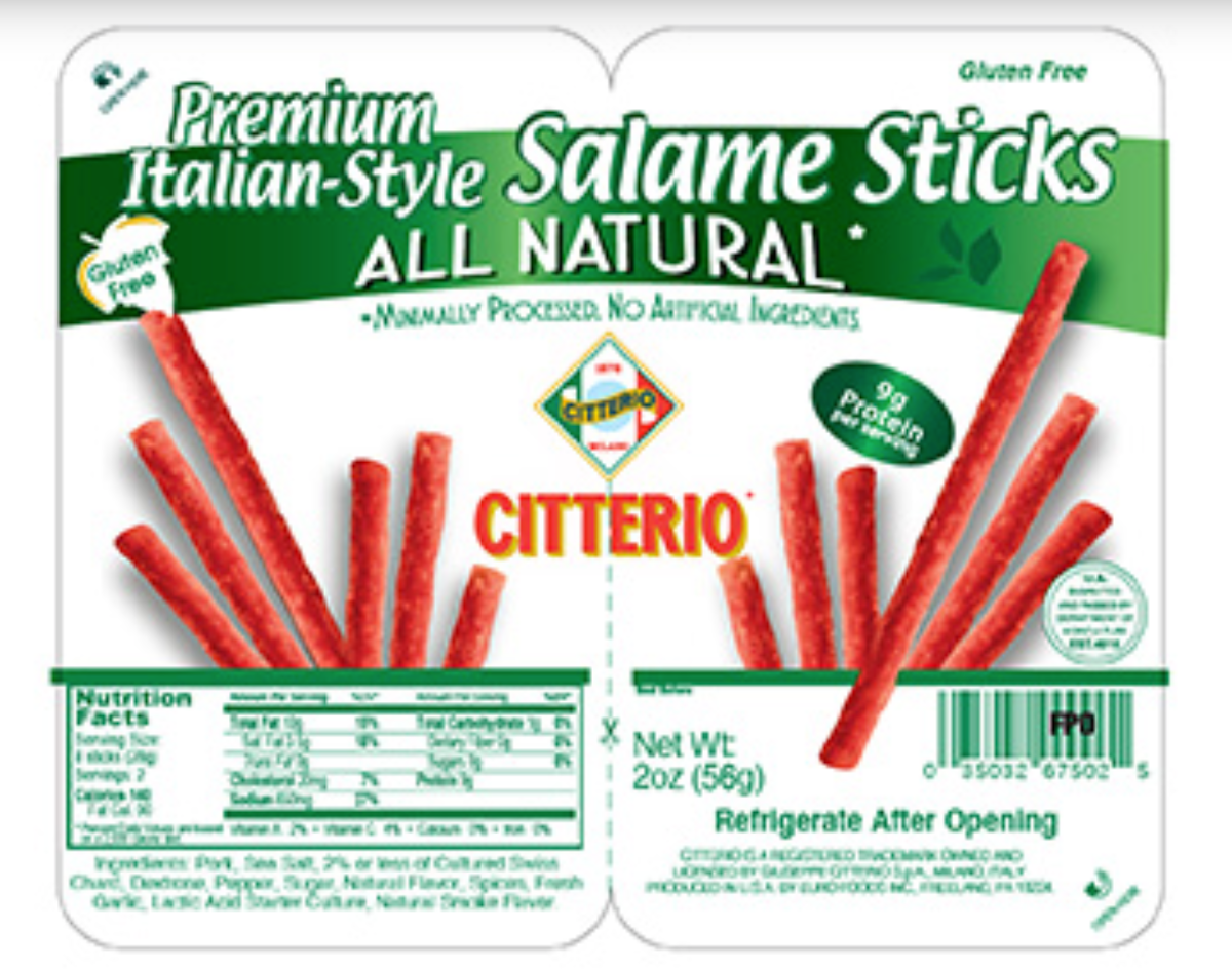 - 2-oz. packages containing Citterio “Premium Italian-Style Salame Sticks ALL NATURAL” with “best by” dates through Jan. 23, 2022, located next to the barcode.