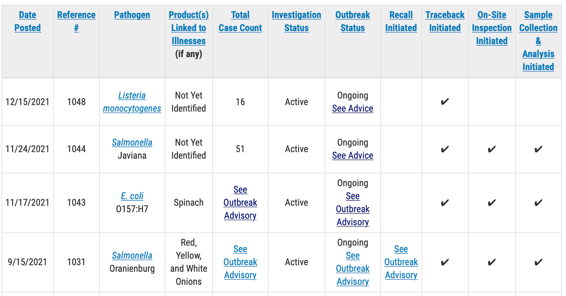 The Food and Drug Administration will issue public health advisories for outbreak investigations that result in “specific, actionable steps for consumers — such as throwing out or avoiding specific foods — to take to protect themselves,” according to the outbreak table page.