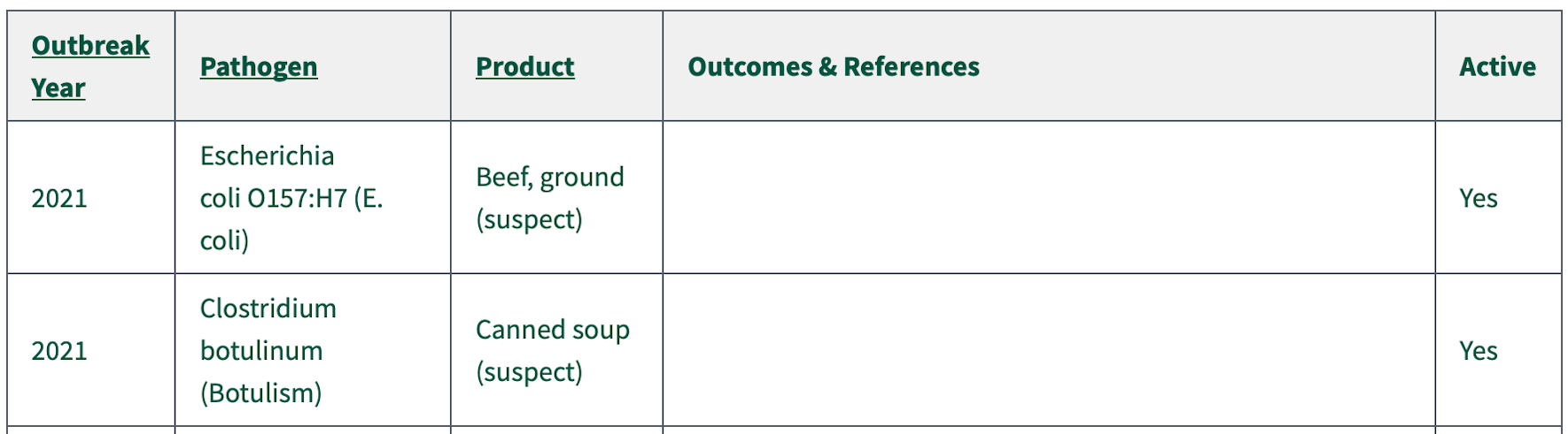 The Outcomes & References column includes links to recall notices, public health alerts, and after-action review reports, as well as CDC outbreak notices for selected multistate foodborne outbreaks, which provide additional information. For a list of all foodborne outbreaks reported to CDC since 1998, please use the CDC National Outbreak Reporting System Dashboard.