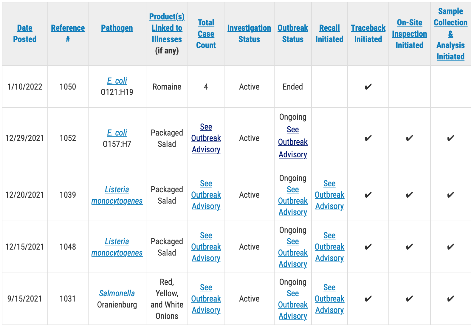 The Food and Drug Administration will issue public health advisories for outbreak investigations that result in “specific, actionable steps for consumers — such as throwing out or avoiding specific foods — to take to protect themselves,” according to the outbreak table page.