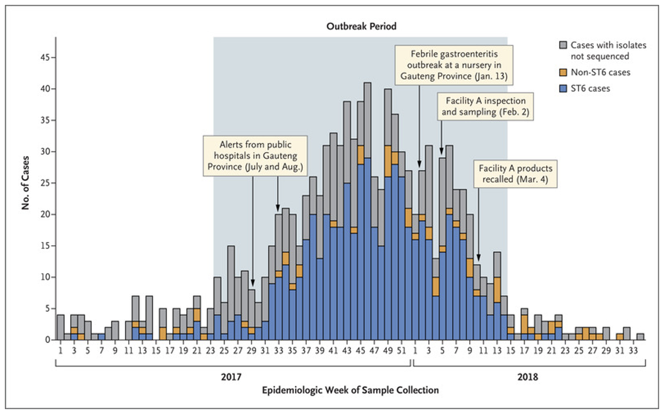 Figure 2. Distribution of Laboratory-Confirmed Cases of Listeriosis, According to Outbreak Week and Major Events (January 1, 2017 to August 21, 2018) (Thomas et al., 2020).