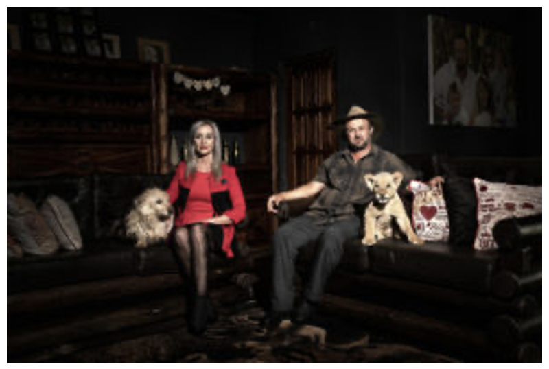 Annelize and Martin Le Roux with their dog Max and their pet lion Caesar on their farm in Winburg, Free State. Annelize suffered a miscarriage at 23 weeks, their baby boy was later diagnosed with listeriosis. (Photo: Thom Pierce)