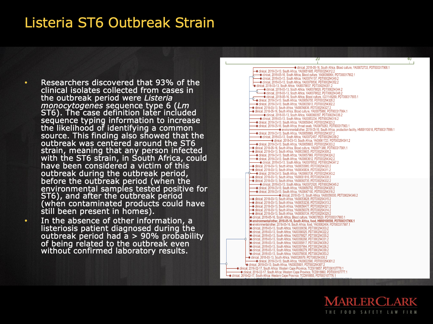 The initial case definition for this outbreak included all cases of listeriosis that occurred in South Africa from 2017 to 2018. The initial case definition was appropriate due to the lack of whole-genome sequencing (WGS) data at the beginning of the outbreak. Multilocus sequencing typing (MLST) was used after to analyze the WGS results. Researchers discovered that 93% of the clinical isolates collected from cases in the outbreak period were Listeria monocytogenessequence type 6 (Lm ST6) (Thomas et al., 2020; Gerner-Smidt). The case definition later included sequence typing information to increase the likelihood of identifying a common source (Besser). This finding also showed that the outbreak was centered around the ST6 strain, meaning that any person infected with the ST6 strain, in South Africa, could have been considered a victim of this outbreak during the outbreak period, before the outbreak period (when the environmental samples tested positive for ST6), and after the outbreak period (when contaminated products could have still been present in homes) (Coulombier).