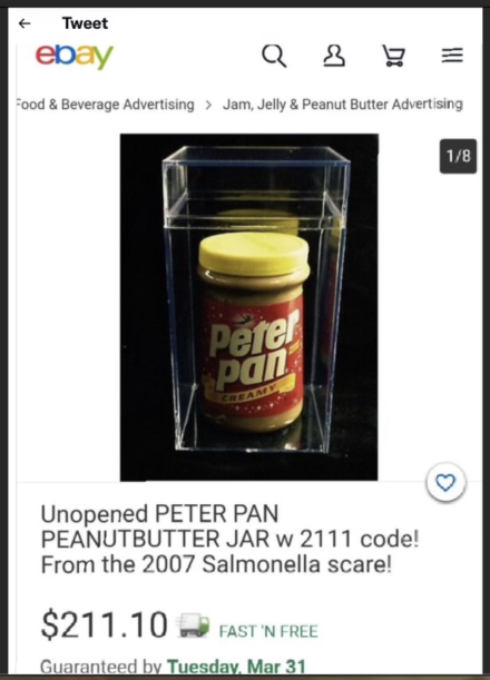 A week ago one of my food safety followers on Twitter sent me this photo that was apparently circulating offering for sale on eBay a product that was recalled over a decade ago. They asked if it was legal for someone to sell a recalled food product.