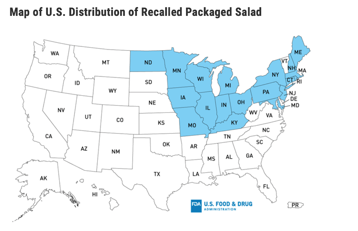 Patients were identified in Illinois, Maryland, Michigan, New Jersey, New York, Ohio, Pennsylvania and Virginia. The implicated salad was distributed in 20 states, mostly in the upper MidWest and New England, suggesting that additional outbreak patients were likely part of this multi-year outbreak.