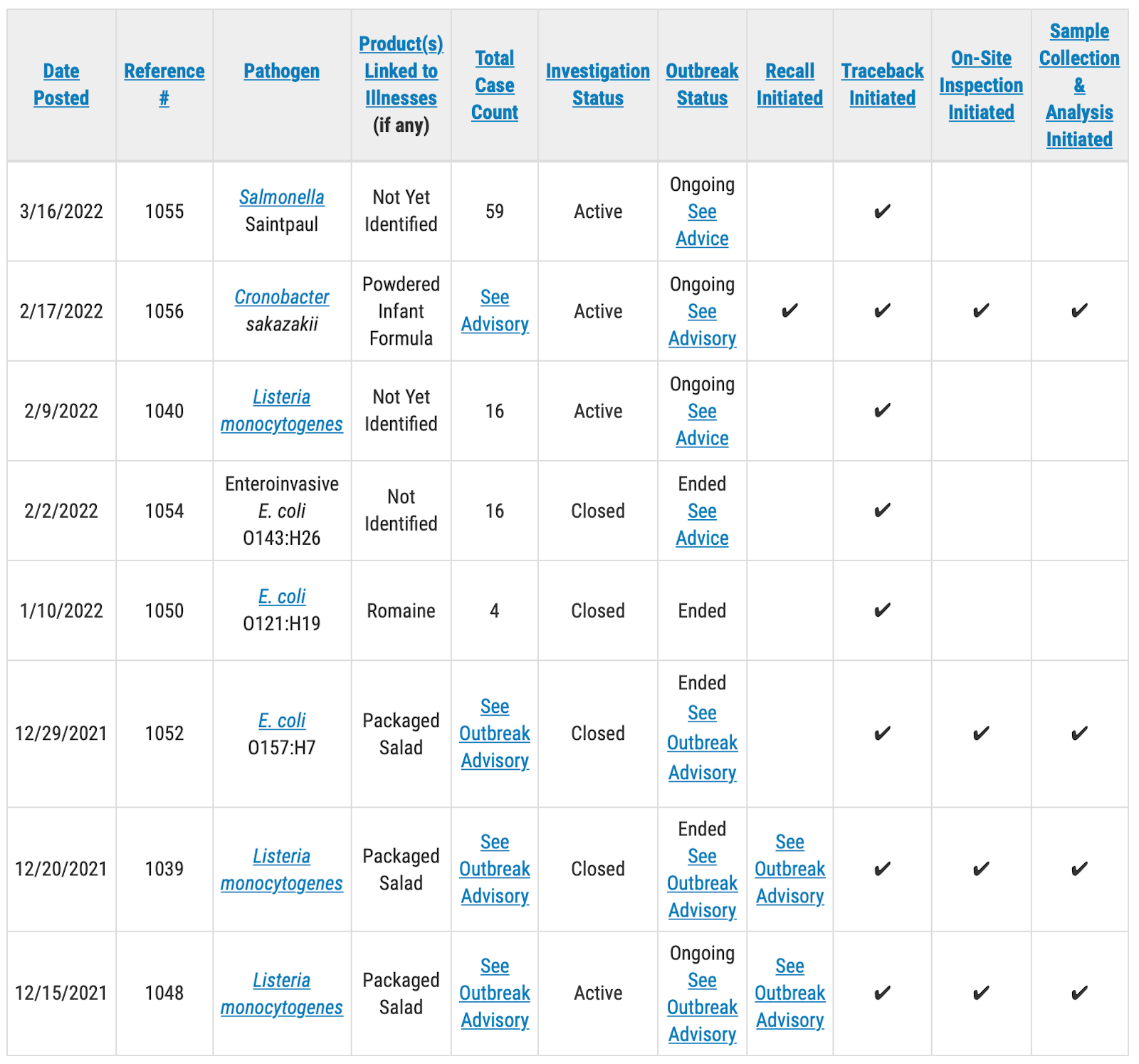 The Food and Drug Administration will issue public health advisories for outbreak investigations that result in “specific, actionable steps for consumers — such as throwing out or avoiding specific foods — to take to protect themselves,” according to the outbreak table page.