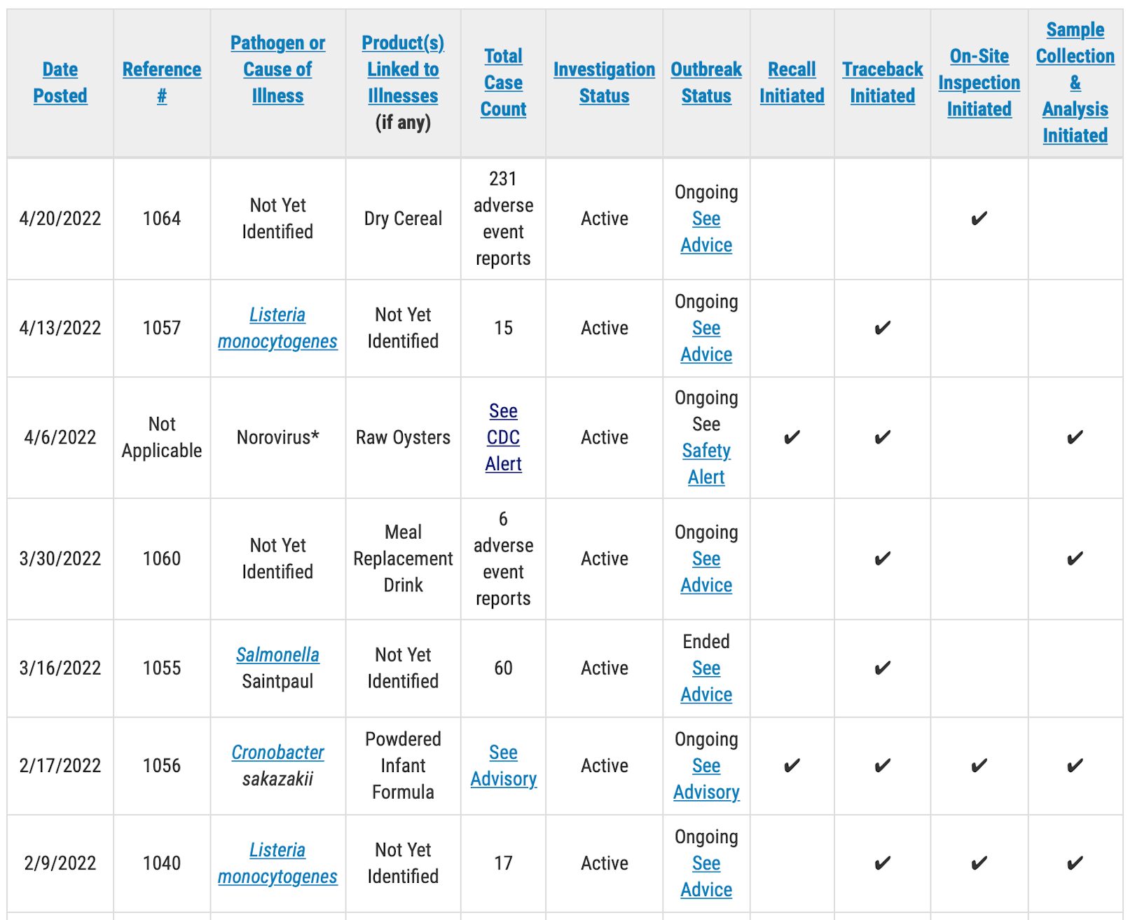 To view the FDA page with links to specific information on individual outbreaks, please click here.