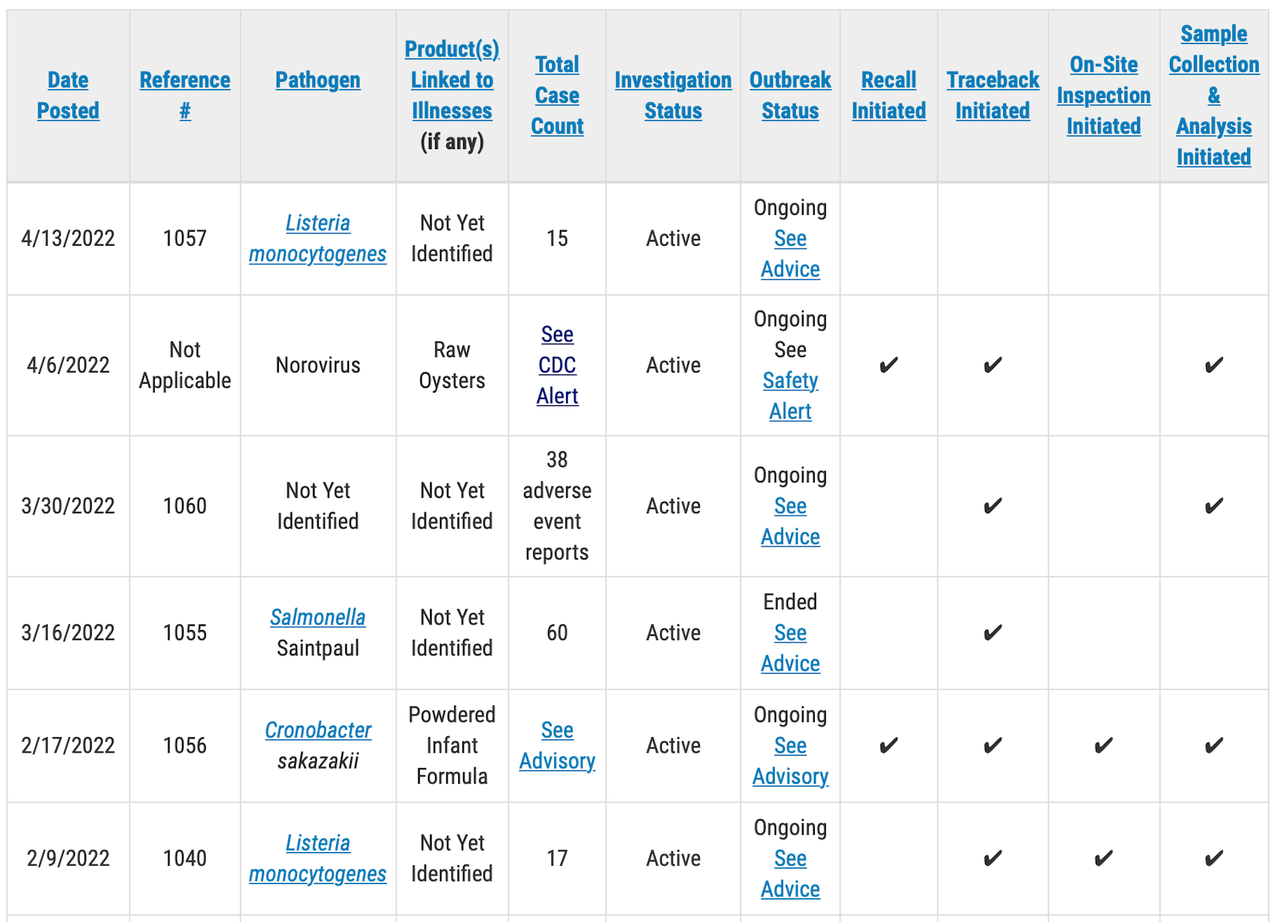 The Food and Drug Administration will issue public health advisories for outbreak investigations that result in “specific, actionable steps for consumers — such as throwing out or avoiding specific foods — to take to protect themselves,” according to the outbreak table page.