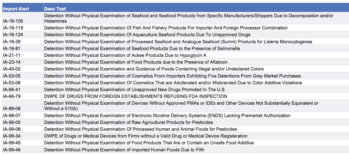 Recent modifications to FDA’s import alerts, as posted by the agency, are listed below. Click here to go to the FDA page with links for specific details about this week’s various alert modifications.
