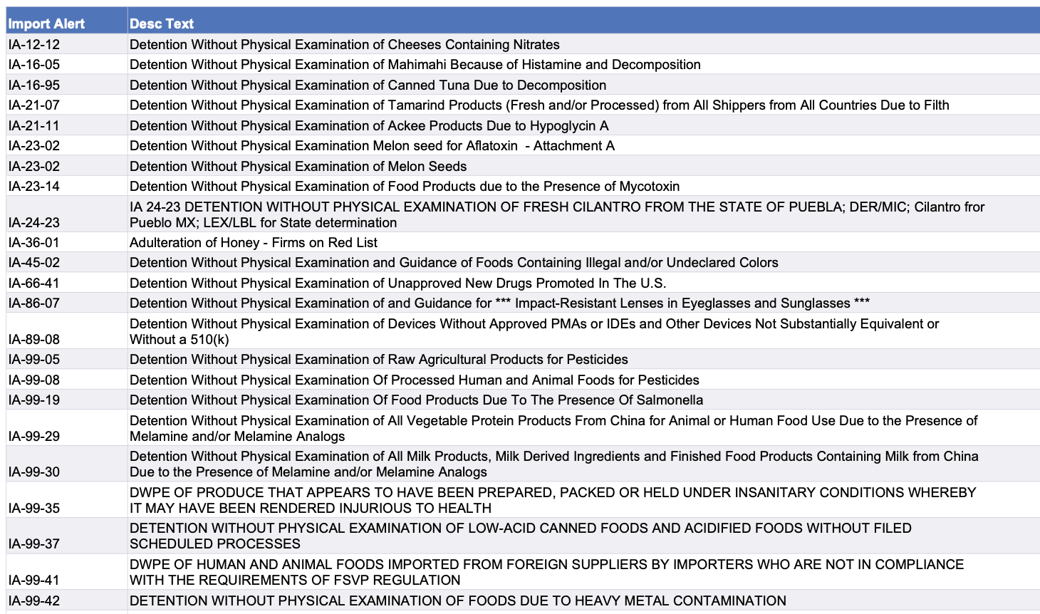 The Food and Drug Administration is continuing its use of import alerts to enforce U.S. food safety regulations for food from foreign countries. The agency updates and modifies the alerts as needed.