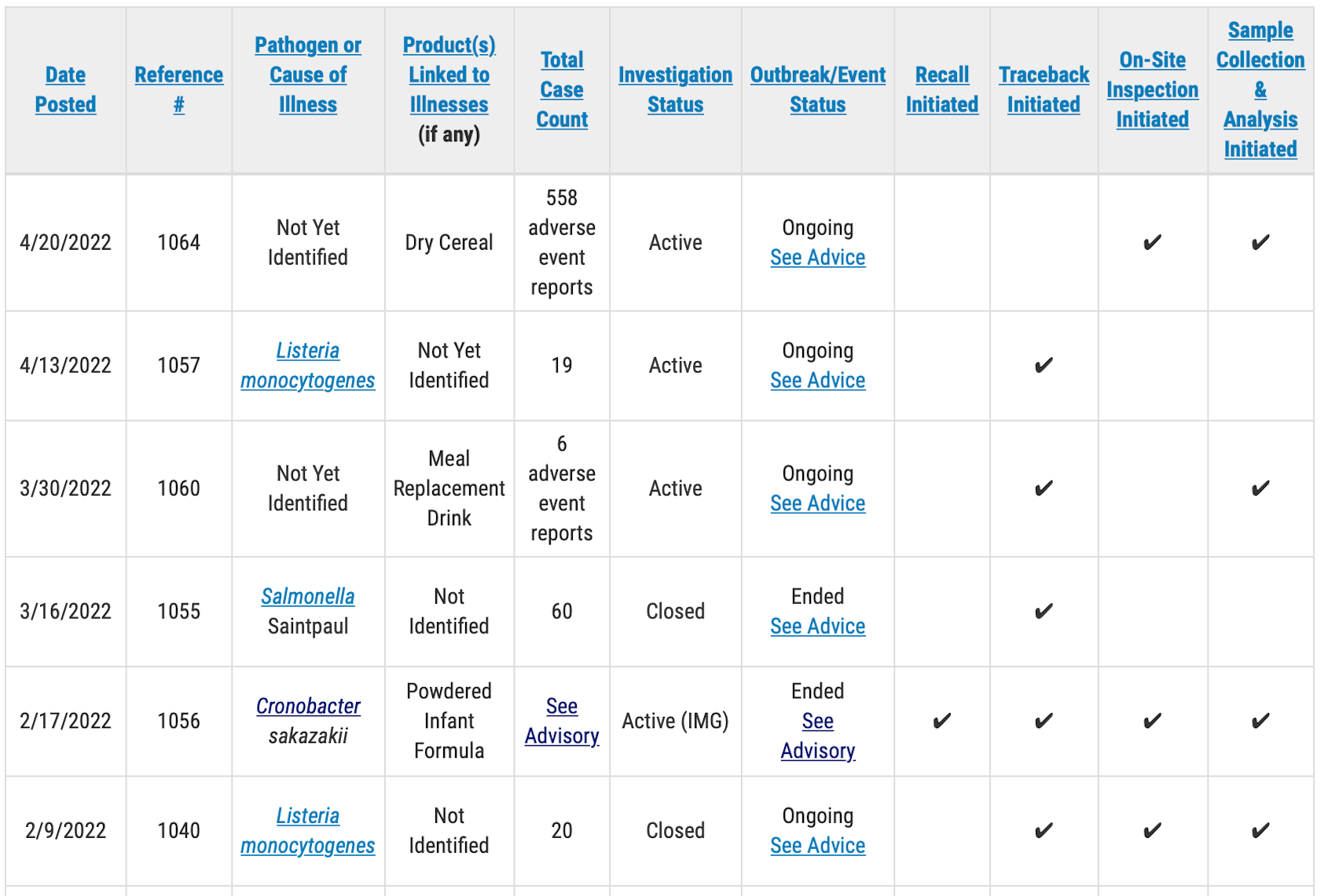 A public health advisory will be issued for investigations that have resulted in specific, actionable steps for consumers to take to protect themselves, according to the FDA. Please direct your attention to those pages for the most up to date information on the investigation and for consumer protection information.
