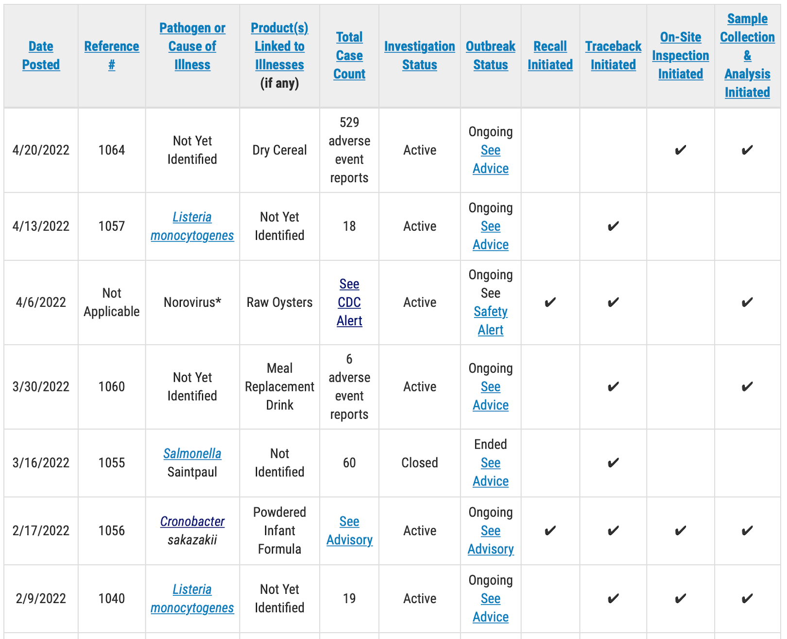 A public health advisory will be issued for investigations that have resulted in specific, actionable steps for consumers to take to protect themselves, according to the FDA. Please direct your attention to those pages for the most up to date information on the investigation and for consumer protection information.
