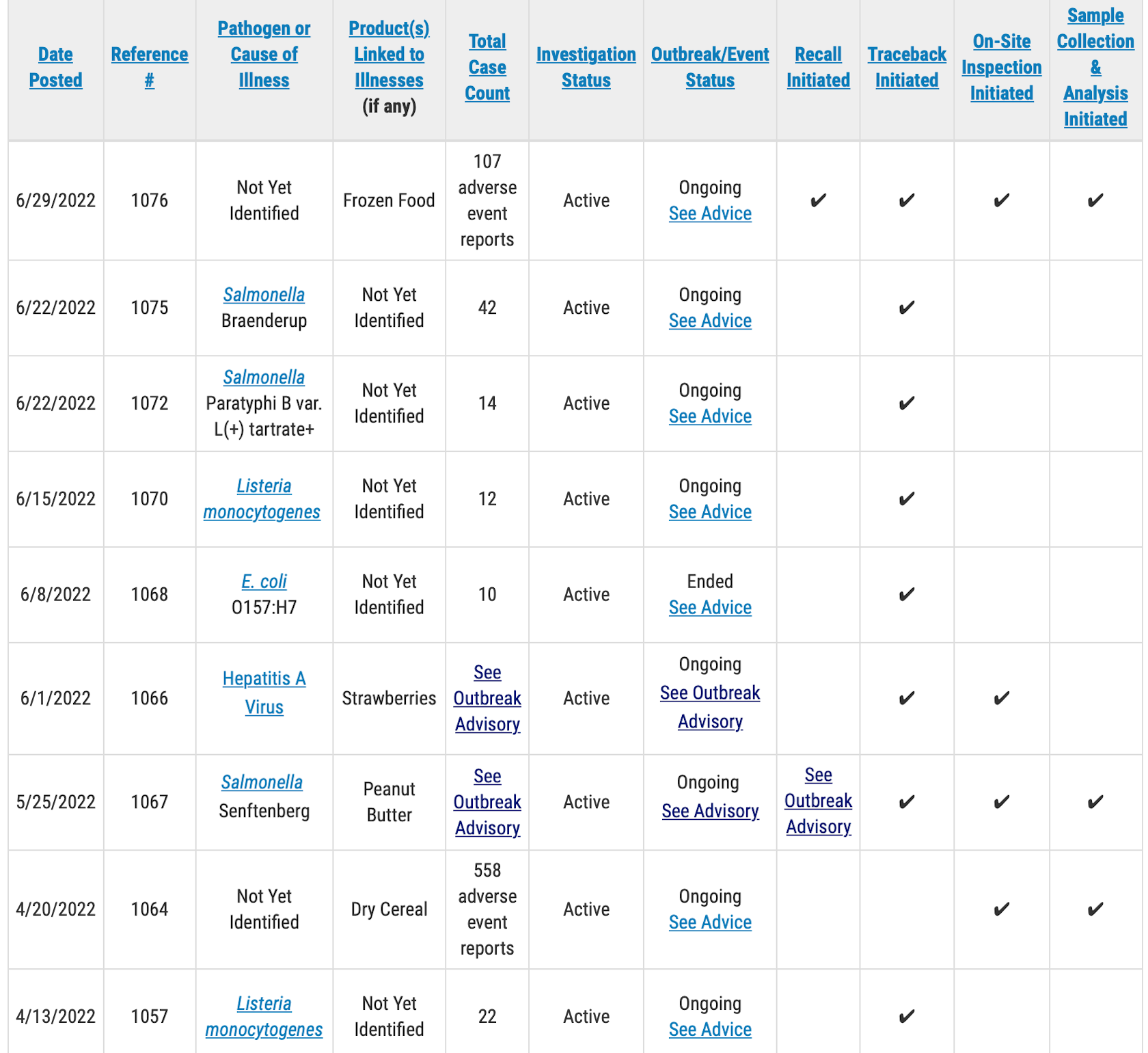 A public health advisory will be issued for investigations that have resulted in specific, actionable steps for consumers to take to protect themselves, according to the FDA. Please direct your attention to those pages for the most up to date information on the investigation and for consumer protection information.
